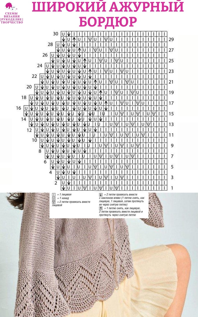 Доброго вечера! Бордюр на изделии подразумевает собой отличающееся от основного узора и украшающее край оформление основного полотна. От каймы бордюр отличается размерами. Каймой можно назвать узкую ажурную полосу. Бордюр же значительно отличается по своей ширине и чаще всего вяжется, плавно перетекая из основного узора, не делая резких переходов, хотя бывают и исключения. Порой в поисках интересного оформления вязаной модели, будь то джемпер или юбка, приходится в поисках затратить массу времени, пока пересмотришь весь предлагаемый материал в интернете. Для себя я создала вот такую небольшую, интересную и необходимую подборку. Возможно кому-то и подойдут собранные здесь варианты. Возможно в вашей коллекции появится ещё одна подборка именно с бордюрами, которые тоже имеют право на существование. Хороших и уютных вам вечеров за приятным занятием. Лично у меня такие вечера скоро заканчиваются, наступает сезон дачных хлопот. Тем не менее, выражаю солидарность тем, кто вяжет постоянно. Нав