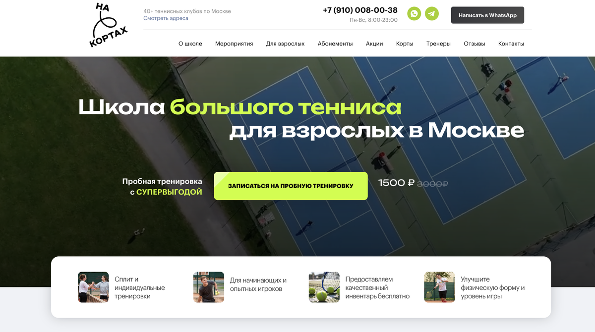 Школа «на-кортах» — проект профессиональных спортсменов, победителей и призеров международных турниров ITF, WTA. До нашего сотрудничества у них не было сайта, все коммуникации шли «сарафанным радио». Основная цель — создать онлайн-платформу, которая покажет онлайн-присутствие и конкурентно отстроит школу на рынке. А также будет привлекать новых клиентов, раскроет ключевые смыслы и не уступит конкурентам, у которых сайты уже давно работают как каналы трафика. Школа ориентируется на несколько сегментов: Дети и подростки (6–18 лет) Молодые люди (18–30 лет) Взрослые (30–55 лет) Пожилые люди (55+) Объединяющим фактором для всех сегментов является желание улучшить здоровье, повысить навыки игры и получить удовольствие от занятий теннисом. В современном мире отсутствие сайта — серьезное упущение. Чтобы школа «на-кортах» могла расти и конкурировать, мы решили: 1. Определили основное УТП и выгоды для клиентов В современном спортивном рынке людям важно, что они получат от сотрудничества. Поэтому
