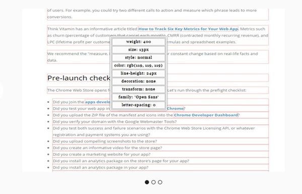 После анализа текста расширение показывает семейство шрифтов, размер и высоту. У вас также есть возможность проверить цветовые коды RGB шрифтов, вес шрифта, высоту строки и т. д.