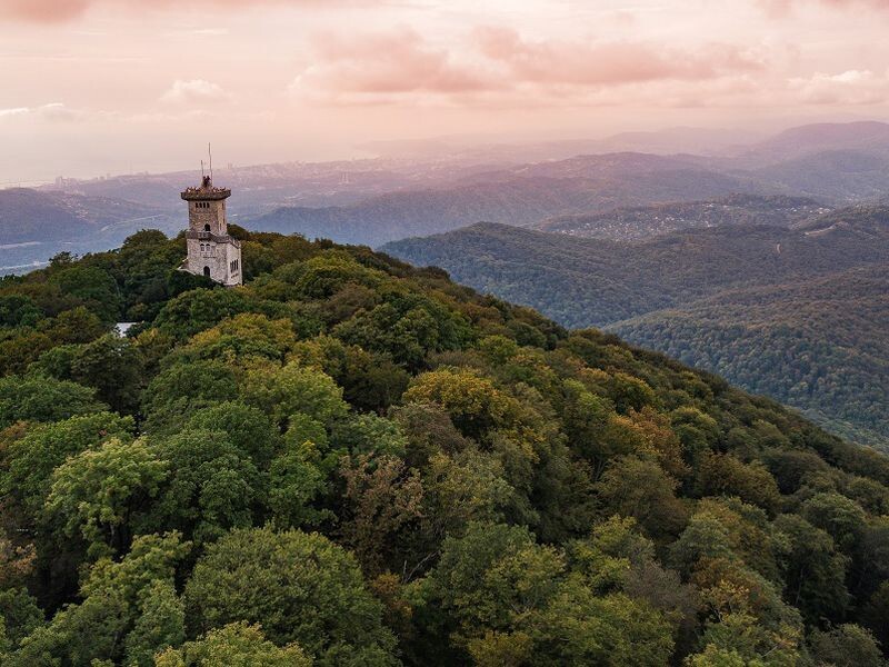 После этого путь лежит на гору Ахун, с которой открываются захватывающие виды на побережье и Кавказский хребет. Гид расскажет интересные истории о башне, которая временно закрыта, и её архитекторе.