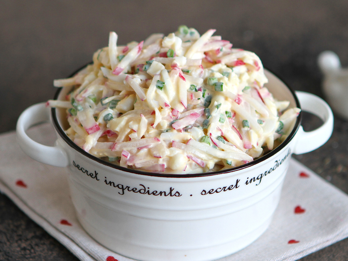 Весной особенно хочется свежих, легких и простых блюд. Салат из редиски с яйцом – классика, но чтобы он получился не просто вкусным, а по-настоящему мягким, нежным и без горечи, мы применим один маленький, но важный кулинарный секрет. Мы подготовим редиску так, чтобы её вкус стал сбалансированным, а салат – еще вкуснее. Берем 200 г свежей редиски, тщательно промываем и срезаем хвостики. Если корнеплод слегка горчит, очищаем кожицу – это поможет смягчить вкус. Чем моложе редиска, тем она сочнее и слаще, но если попалась крепкая и ядреная, можно замочить ее на 10 минут в холодной воде. Два куриных яйца промываем, кладем в сотейник, заливаем холодной водой и доводим до кипения. Как только закипит, добавляем щепотку соли и варим ровно 10 минут. После этого сразу сливаем горячую воду и охлаждаем яйца под проточной холодной водой. Такая резкая смена температуры поможет легко очистить скорлупу, а белок останется плотным и упругим. Важно не переварить яйца – если держать их дольше, желток стан