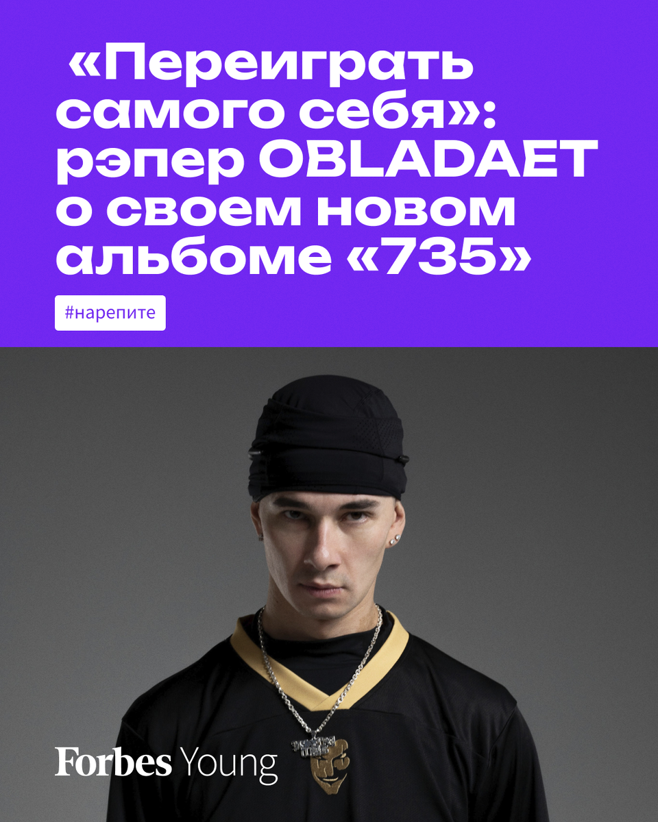 Рэп-артист Назар Вотяков, известный как OBLADAET, свой первый лонгплей выпустил в 2015 году. В дискографии рэпера шесть альбомов и три мини-альбома, в том числе PLAYERS CLUB и PLAYERS CLUB 2, получившие «8 платин». В марте OBLADAET представил новый альбом — «735», в работе над которым приняли участие трэп-исполнитель ICEGERGERT (Георгий Гергерт), рэперы YASMI (Денис Хохлов) и «Полка» (Игорь Кошкин) и французский хип-хоп-исполнитель Enzo from the Block. Что OBLADAET рассказал Forbes Young о новом альбоме, взаимодействии с другими исполнителями и продюсерами, которые помогали в создании релиза, а также о том, почему «735» не стал частью трилогии PLAYERS CLUB, — читайте на сайте Forbes #нарепите @forbes_young О треке POSTER «Считаю этот трек гимном нашего баскетбольного клуба (OBLADAET основал баскетбольный клуб PLAYERS CLUB. — Forbes Young). Когда наша команда начала играть в Медиалиге (Баскетбольная медиалига MEDIA BASKET. — Forbes Young), встал вопрос — под какой трек выходить?