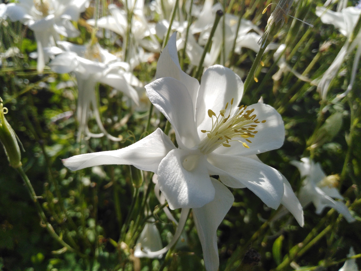 Белые разошлись по саду. Этим аквилегиям "Кристалл" в цветнике у Летней кухни уже много лет, цветут в начале июля вместе с вероникой длиннолистной и цикорием обыкновенным, безмерно обожаю их сочетание с синим.
