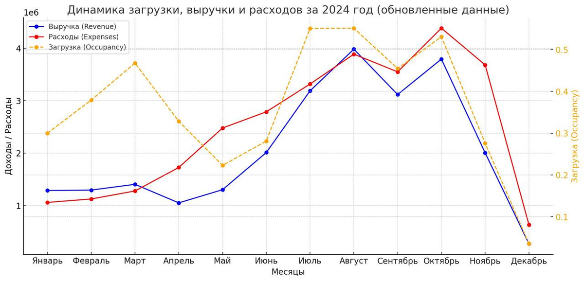 Разберём этот вопрос на примере условного глэмпинга «Не Радость» 😏, который проработал год в популярном туристическом месте. Совпадения с реальными объектами случайны! 😎 Прежде чем углубляться в детали, взгляните на графики, приложенные к посту. Они наглядно показывают, как прогнозы расходятся с действительностью. На этапе финансового планирования часто ориентируются на усреднённые показатели, составленные финансистами. Однако такие модели не учитывают множество факторов: конкретную локацию, сезонность, рыночную конкуренцию, текущее состояние экономики и этап развития проекта. В итоге расчёты строятся на обезличенных цифрах из сети, которые далеки от реальности. Отдельный провал — расчёт затрат. Многие начинающие владельцы глэмпингов уверены, что смогут управляться с минимальным персоналом: один администратор, техник и горничная на 15 номеров. Но в реальности для такого объекта нужен полноценный штат — примерно 15 человек. В него входят администраторы, обслуживающий персонал, управля