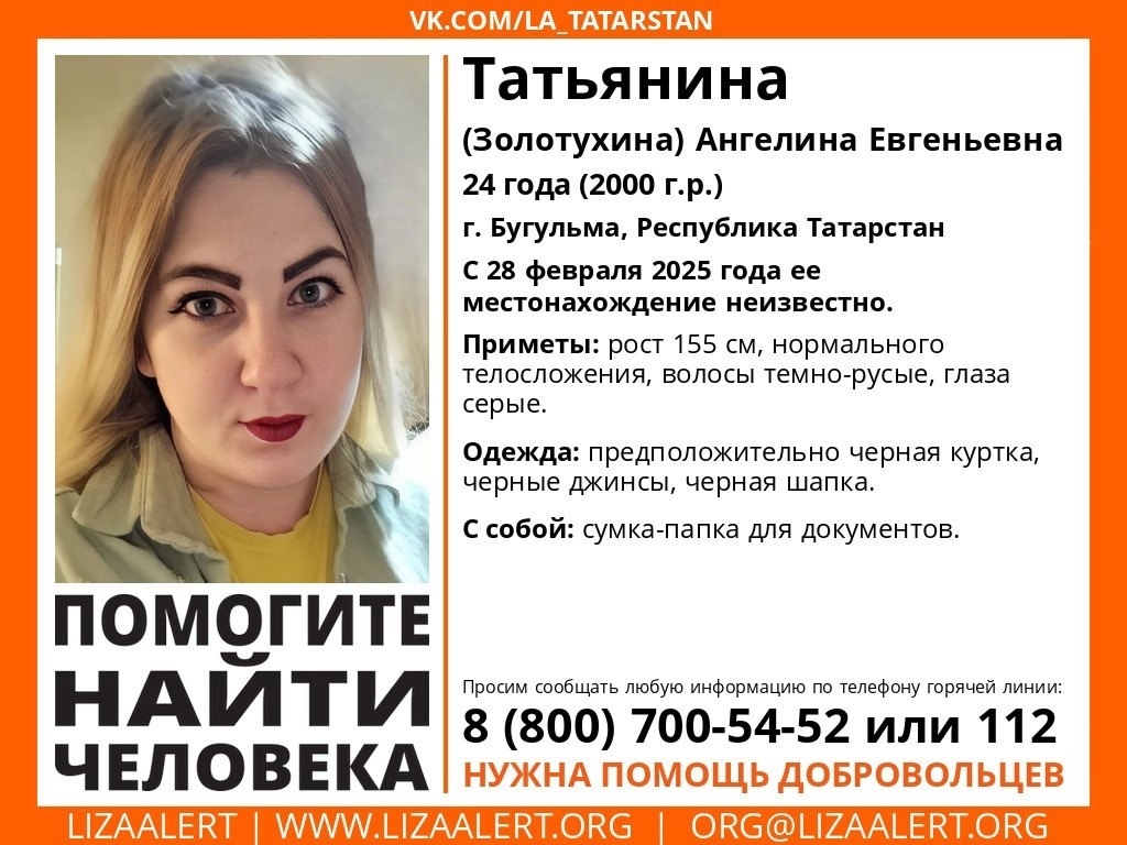 В соседней республике Татарстан пропала 24-летня Татьянина (Золотухина) Ангелина. Как сообщает поисковый отряд "ЛизаАлерт" Башкортостан, девушка может находиться в нашем регионе. Ангелина Евгеньевна, 2000 г.р., пропала в г. Бугульме Республики Татарстан еще в последний день февраля текущего года. Предположительно была одета в черную куртку, черные джинсы, черную шапку, с собой взяла сумку-папку для документов.