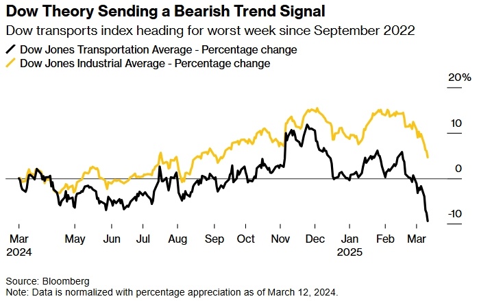Теория Доу, известная также как теория Доу-Джонса, утверждает, что движение индекса Dow Jones Industrial Average должно подтверждаться движением транспортных акций и наоборот, чтобы быть устойчивым. Индикатор, который уже много лет помогает предсказывать движение фондового рынка США, теперь сигнализирует о новых трудностях для инвесторов. Теория Доу, известная также как теория Доу-Джонса, утверждает, что движение индекса Dow Jones Industrial Average должно подтверждаться движением транспортных акций и наоборот, чтобы быть устойчивым. По состоянию на закрытие торгов в четверг, индекс Dow Jones Transportation Average, который считается барометром потребительского и промышленного спроса, упал на 19% по сравнению с пиковым значением в ноябре. Это падение произошло на фоне снижения индекса Dow Jones Industrial Average на 9,3% по сравнению с декабрьским рекордом. Эти данные вызывают беспокойство на фондовом рынке, который в последние дни пострадал из-за растущей обеспокоенности по поводу сос