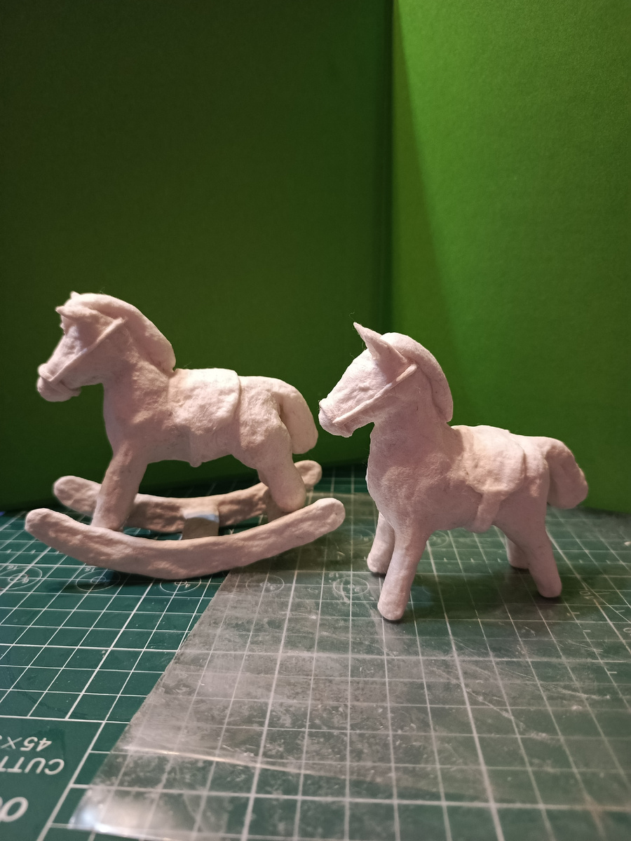 Любимая пятница!!! Как же я ей рада! Во-первых после нее наступают выходные, во-вторых мы с Савой завтра идем в студию, но главное - к пятнице я готовлю или статью про ватушки, или показываю новую игрушку. А сегодня я еще и калякала малякала. Знаете детскую песенку? Андрей рисовал на листочке Колесики, стрелочки, точки, Над домом - каляки-маляки, В колясках - маляки-ребяки, Болели в больницах боляки, Клонили калину каляки, Манили в малину маляки, И рвали рябину ребяки! Вот и малякала я ребяков. Но сначала домалякала коняку, правда одного, второму качалку недоделала. За-то обоих оформила. Я совершенно забыла про уздечку, по этому была рада подсказке читателей. Кони стали именно конями. Почти всю неделю я настраивалась на раскрашивание игрушек. Видимо из-за вот этой своей боязни испортить игрушку я и перешла на цветную вату. Но благодаря вам, мои дорогие читатели, начинаю преодолевать свой страх. Да и вообще вы меня очень мотивируете на регулярную работу с ватой и придумывание своих игру