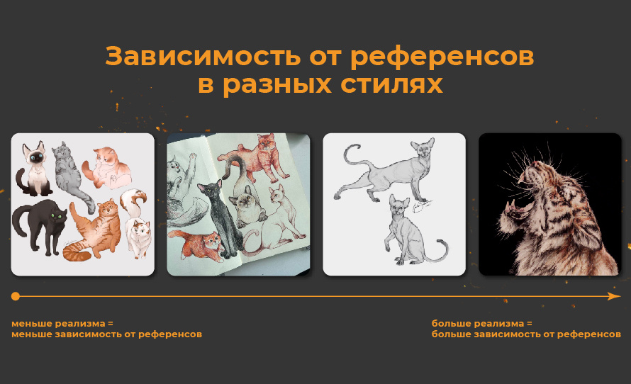Мы с вами уже рассматривали, как перейти от референсов к рисованию из головы вот в этой статье, и что это будет возможно только при понимании внутреннего строения. Потому что тогда процесс смены позы и придумывания ее из головы будет похож на конструктор. А сегодня давайте поговорим о немного другой стороне вопроса: а реально ли вообще отойти от референсов? Например, почему кто то может рисовать почти все свои картинки вообще без них (в том числе сложные позы людей и животных), а кто то при такой попытке сразу уходит от правдоподобности, и работы начинают смотреться плохо. В чем же дело, если мы возьмем, что скилл у этих людей одинаковый, оба понимают внутреннее строение и могут свободно поменять позу? Ответ: дело в стилистике. Если объединить самые разные стили в группы по уровню реалистичности, то мы получим примерно такую градацию: реализм - полуреализм - мультяшный / аниме стиль - геймарт - детская / книжная иллюстрация - примитивизм - авангардные и сюрреалистичные стили. Причем гр