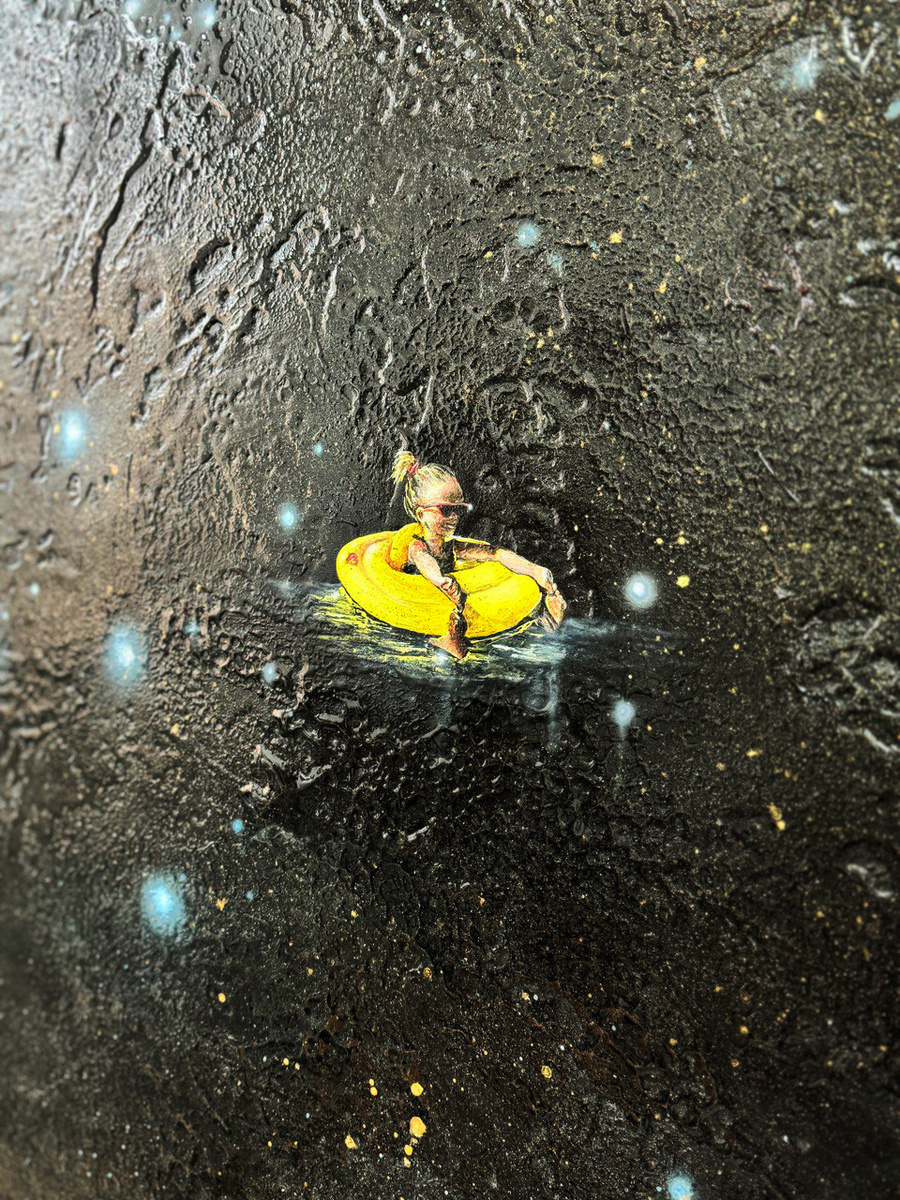 Холст 165 х 120 см, и в этом холсте вся символика свободы современности. Поймать вечность помогает образ девочки, плывущей в бесконечности — это глубокий символ внутренней свободы, принятия жизни и умения радоваться моменту. Это картина «Свободная сдержанность». Космос здесь — это мир возможностей, бескрайнее пространство, в котором нет ограничений. Сегодня современная психология говорит нам: человек счастлив, когда чувствует, что может быть собой, когда он расслаблен и позволяет себе наслаждаться жизнью. Девочка в солнечных очках — как раз об этом. Она не смотрит в пустоту вселенной с тревогой, не ищет ответы, она уже нашла их в себе. Желтый, воздушный круг — это символ солнца, защиты, легкости и детской непосредственности. Он словно держит ее в потоке жизни, давая уверенность, что все хорошо, что можно довериться этому моменту. Девочка ухватилась за пальцы ног — жест, наполненный игривостью и радостью бытия. Это поза полного расслабления, удовольствия от тела, от себя, от окружающего
