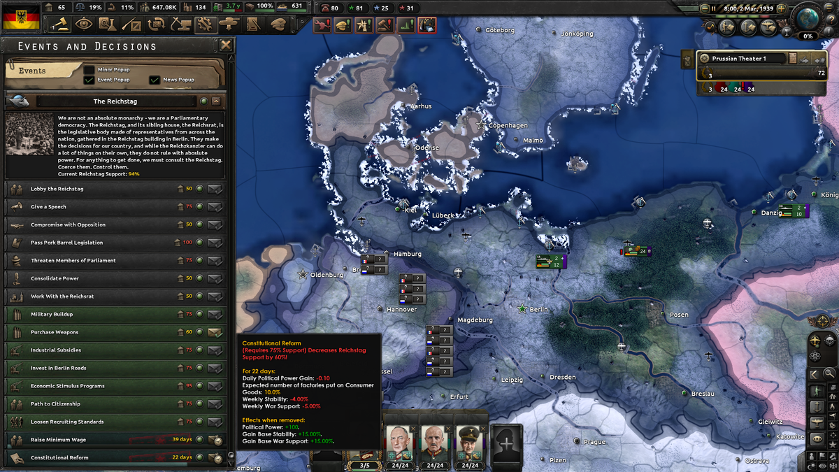 Здравия желаю, бовгары и гости Бовгарии! Сегодня мы продолжим путь Пруссии из грязи в князи и наконец уничтожим нависшее на Европой французское иго в моде Gates of Versailles. А если хотите узнать, как мы до жизни такой докатились, то жмите сюда: После победы над Баварией мы столкнулись с относительно низкой поддержкой населения и маленьким желанием воевать за объединение Германии. Призадумался президент Шлейхер, да и предложил немного обновить конституцию. Бюргеры приняли её на ура. В плане политики внешней мы начали подготовку к войне с Францией и объединение с дружественными нам княжествами, а именно с Вюртембергом, И Баденом. Для повышения шансов на победу мы должны знать вражеские планы и при этом сохранять в безопасности свои, поэтому было создано Министерство государственной безопасности (или просто Штази). Для усиления нашей армии мы воспользовались новым словом в военной науке – танкетками. Последней страной для объединения Германии до войны должна была стать Вестфалия. Прези