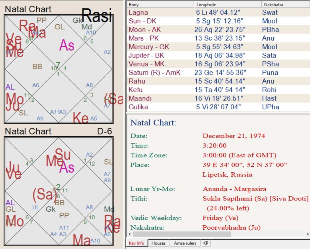 Шаштамша (Д6) — важная карта в ведической астрологии, отвечающая за здоровье, болезни, лечение, а также профессиональные проблемы, долги, судебные процессы и споры. Она показывает общую силу организма и его сопротивляемость болезням, а также указывает на моменты возникновения заболеваний. Рассмотрим влияние Д6 на примере карты мужчины. Основные показатели здоровья (Д1, Д6, Д9): Выводы по здоровью: В Настоящий момент у мужчины идет период Кету-Сатурн. Как это влияет на его здоровье 🔍 Основные тенденции Возможные проблемы в период Кету-Сатурн: 🔴 1. Хронические заболевания: Обострение старых проблем со здоровьем, утомляемость. 🔴 2. Проблемы с суставами и костями: Возможны боли в спине, суставах, повышенный риск травм. 🔴 3. Нервная система: Возможны тревожность, депрессия, нарушения сна. 🔴 4. ЖКТ и обмен веществ: Вздутие, метаболические сбои, ослабление иммунитета. 🔴 5. Гормональный дисбаланс: Возможны проблемы с кожей, щитовидной железой, репродуктивной системой. 🔹 Как поддерживать