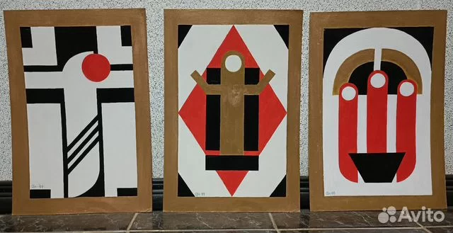 Триптих "Распятие, Спас в силах, Троица", созданный известным в художественных кругах художником Сергеем Маковеем. https://vk.com/s_macovei Этот триптих, выполненный в технике масла на картоне (размер каждой части 50x35 см), представляет собой глубокую интерпретацию ключевых символов христианской традиции через призму современного минимализма. Работа объединяет в себе богатство символики и чистоту формы, что делает её поистине уникальной. ### Левая часть — "Распятие" Мощное воплощение трагизма и величия. Строгая геометрия сочетается с акцентным красным кругом, символизирующим жертву и искупление. Пересекающиеся линии словно соединяют земное и небесное, создавая динамику и напряжение, которые не оставят равнодушным ни одного зрителя. ### Центральная часть — "Спас в силах" В центре композиции — образ Христа в позе благословения, окружённый красным ромбом. Этот элемент ассоциируется с сиянием и божественной энергией. Геометрия полотна уравновешена золотыми и чёрными элементами, усиливая в