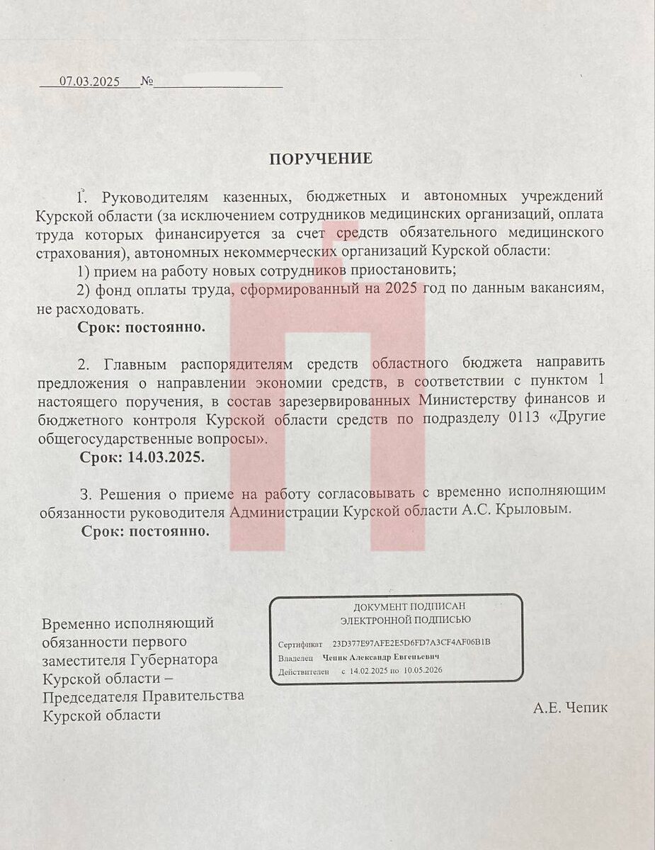 В распоряжении «Площади» оказалось поручение врио первого замгубернатора Александра Чепика для руководителей казенных, бюджетных и автономных учреждений о приостановлении приема на работу новых сотрудников.