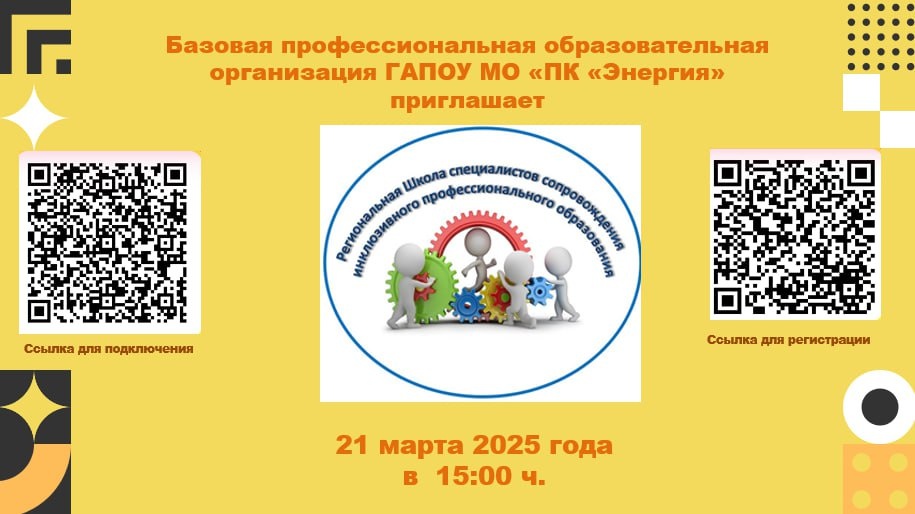 Базовая профессиональная образовательная организация ГАПОУ МО «ПК «Энергия» 21 марта 2025 года в 15.00 час. приглашает на занятие Региональной школы специалистов сопровождения инклюзивного профессионального образования «Возрастные особенности обучающихся с различными диагнозами и нозологиями». Участники: педагоги-психологи, социальные педагоги, ассистенты – помощники, тьюторы, педагогические работники профессиональных образовательных организаций и образовательных организаций высшего образования, расположенных на территории Московской области Ссылка для подключения: https://vk.com/call/join/hLNtZCVparTdf1rT5AdKM2wUhmJkt1K6BapB237V9MY