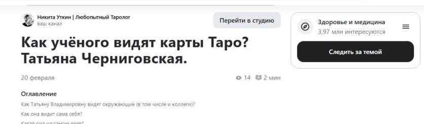 Уж не знаю почему, но Дзен не даёт возможности автору самому выбрать тему своей статьи. Алгоритмы спустя время как-то анализируют по ключевым словам, что-то присваивают, находят аудиторию. Но иногда случаются ошибки. И этого можно было бы избежать, если дать возможность автору указывать при публикации о чём статья. Это же не трудно, да? И Дзену легче. Мой расклад на Татьяну Черниговскую алгоритм отнёс не к Таро, не к эзотерике, не к науке хотя бы. А, блин, к медицине. Почему? С чего вдруг? Кстати, вот эта статья: Хотя, иногда пусть Дзен и ошибается, но всё же плюс-минус определяет верную тематику Расклад на Филиппа Киркорова получил тему "Шоу-бизнес". Не "Таро" или "Эзотерика", но в целом тоже неплохо. А есть куча статей, где Дзен не смог присвоить тему вообще, вот никакую, даже ошибочно. Хотя ключевых слов было предостаточно (можно было и у меня как у автора спросить, в конце концов). Многие авторы жалуются, что у их статей нет показов (или их мало). Причина в том числе и пото