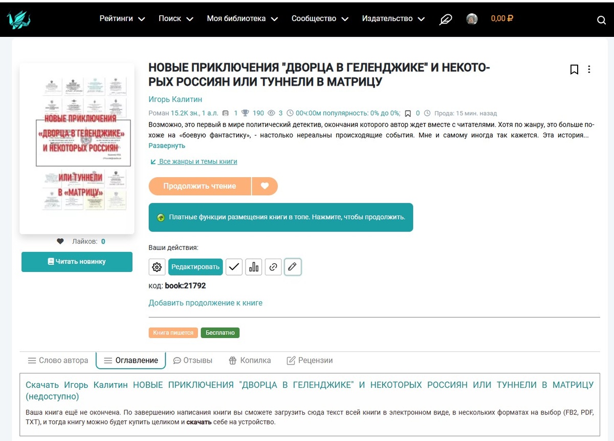 Ещё "шажок" вперед. Ну как "шажок"? - ГИГАНТСКИЙ ШАГ. На днях начал публикацию "книжного" варианта своей истории "дворца в Геленджике", начатой здесь, на яндекс.дзене летом 2021 года и дошедшей уже до "главы 9": И на подходе глава 10. Разбирательство с "осечкой" следственного комитета, и "контузией" руководителей МВД, с помочью официального подключения ФСБ. Пока что книга (часть) "НОВЫХ ПРИКЛЮЧЕНИЙ "ДВОРЦА В ГЕЛЕНДЖИКЕ" И НЕКОТОРЫХ РОССИЯН ИЛИ ТУННЕЛИ В "МАТРИЦУ" доступна на издательском сервисе "Целлюлоза": Чем история эта история отличается от моих публикаций "про дворец" на дзене? В книге упор в повествовании делается не столько на явных ошибках застройщика, сколько на попустительстве/ преступлениях "представителей органов исполнительной власти" и последствиями этого для них. Каждый получит ровно то, что заслужил. И кое-кто уже получил. Оказалось, опубликоваться не так-то просто. Особенно с такой "историей". Смелых мало. До этого получил отказ от "Литреса": Они просто отказались от