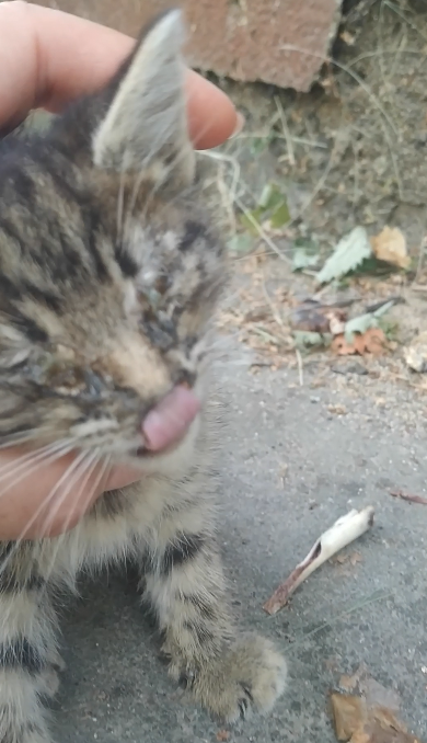 4 сентября 2024 года вышла я покормить котиков и заодно - зайти в магазин. Первым делом пошла в магазин. И увидела его. Глаза и нос залеплены гноем, дышать может только ртом. Крошечный, жалобно мяукает. Ну как пройти мимо? (А ведь кто-то проходил. Я ведь днём вышла. А он, явно, не прямо перед моим приходом появился) Взяла с собой (слава богу, он был не диким). Покормила уличных котиков и пошла с подобрышем домой. Отмыла глазки и носик. Увидев результат, испугалась, что глазок у него нет, так как они всё равно не открывались полностью. Обработала специальным средством и мазью. Оказалось - это кошечка. И так как она крошечная, как бусинка, я её и назвала - Бусинка, Буся. Смотрела на неё, и сердце сжималось - такая она была жалкая. Сначала положила Бусинку в ящичек. Но она недолго там находилась. Она стала спать со мной. Я её несколько раз за ночь кормила, потом с ней играла, сажала её на лоток. И так много ночей подряд. За две недели глазки и носик зажили. И глазки были на месте!!!!!