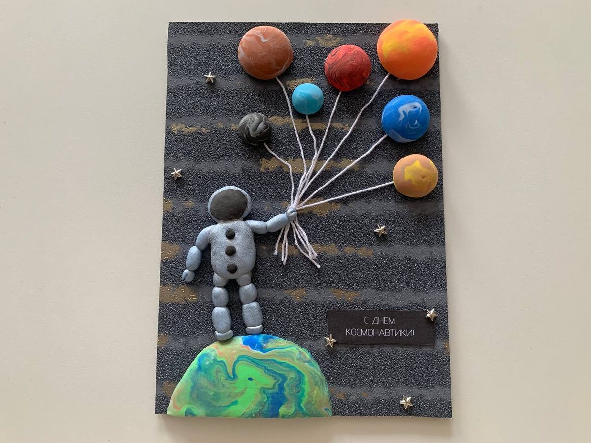 Космос всегда манил человечество своей загадочностью и бескрайними просторами. Каждый год, 12 апреля, мы отмечаем День космонавтики, посвященный первому полету человека в космос. А в садиках и школах задают поделки на эту тему. В этой статье предлагаю вам простую и увлекательную композицию из воздушного пластилина. В качестве фона можно использовать картон, бумагу или обои темных цветов. Картон или бумагу можно покрасить в черный цвет и набрызгать белую краску, имитируя звезды. У меня был темный кусочек старых обоев, решила использовать его. Дополнительно для устойчивости работы приклеила обои на плотный картон. По задумке космонавт стоит на планете Земля и держит в руках воздушные шарики - планеты Солнечной системы. Для создания Земли нам понадобиться пластилин зеленого, коричневого, белого и, конечно, синего цветов. Смешиваем их вместе, но не до конца, чтобы все цвета были видны. Затем формируем большой полукруг. Свежий пластилин хорошо приклеивается к картону или бумаге. А если он с