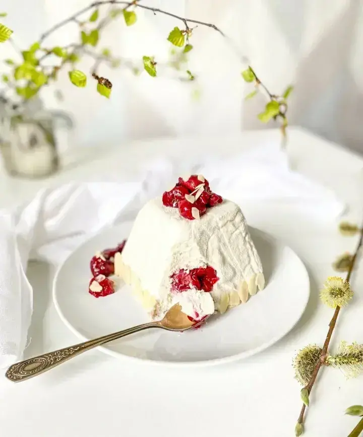 Перед подачей вынуть из формочек, украсить оставшимися винными вишнями и лепестками миндаля.