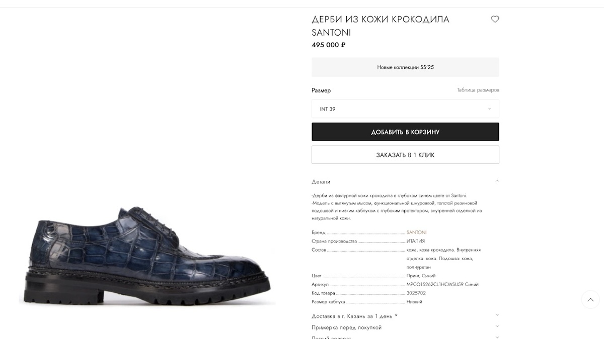 Как давно я заказывал себе ботинки в интернете? Да практически никогда. Исключение составляли только лишь кроссовки, вот что действительно я люблю заказывать в магазинах интернета. Но купить ботинки из крокодиловой кожи, также давнее желание. Нужно обратить внимание, что это ботинки производства Италия. И на этом можно и закончить данный рассказ, так как итальянская обувь говорит сама по себе. Находясь в Казани я решил всё-таки заказать эти ботинки стоимостью 495 000 руб. синего цвета. Через два дня мне привезли эти ботинки. Это был курьер молодого возраста, который ждал, как долго их буду мерить, и после этого принял оплату по карте. Обрадовавшись за свои покупки я рассказал об этом своим друзья. В этот же вечер мы решили пройти в ресторан для того, чтобы отпраздновать данную покупку. Оказалось, что чтобы одеть синие ботинки, мне нужны были синие брюки ну или как минимум такого оттенка. Посмотрев в свой гардероб я не увидеть там синих брюк. Каково же зачарования, когда я не мо