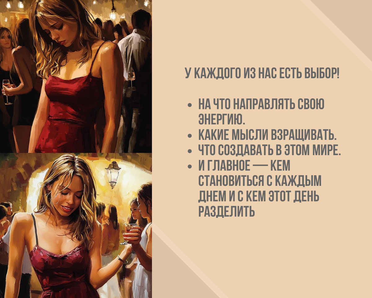 ✅ Фокусируется на себе — общается с друзьями, танцует, радуется вечеру.