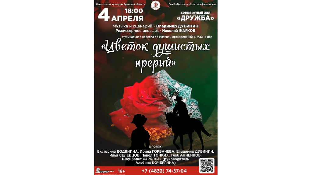 На сцене Брянской областной филармонии представлят музыкальную новеллу Владимира Дубинина «Цветок душистых прерий» по мотивам произведений известного английского писателя Томаса Майн Рида. Она пройдет 4 апреля в 18:00.
