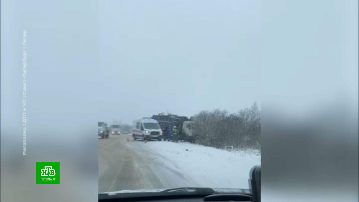 [ Смотреть видео на сайте НТВ ] Весенний снегопад и порывистый ветер стали причиной множества аварий в Петербурге и Ленинградской области. Около поселка Усть-Ижора в Колпинском районе водитель МАЗа не смог затормозить перед пассажирским автобусом, по инерции досталось и нескольким машинам. В итоге образовался паровозик из шести участников ДТП. Пострадали три пассажира автобуса. Общественный транспорт 370-го маршрута съехал со Звериницкой улицы в Павловске. Переменчивая погода добавила нестабильности и на внутреннем кольце КАДа после Таллинского шоссе. Там скорость до нуля вынуждено сбросили как минимум четыре участника аварии. Гибелью водителя закончилась авария на областной трассе в Киришском районе. Около полудня 74-летняя женщина на автомобиле Renault Logan не справилась с управлением и выехала на встречку, где совершила лобовое столкновение с КамАЗом. После удара мусоровоз съехал в кювет, а женщина-водитель скончалась на месте происшествия. [ Смотреть видео на сайте НТВ ]