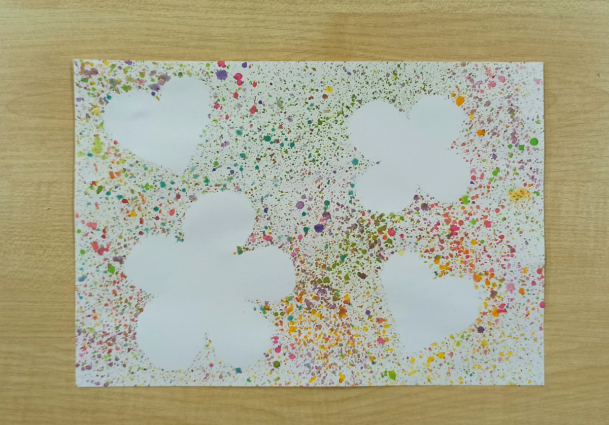 «Набрызг» или рисование брызгами — это несложная и интересная техника для творчества, подразумевающая разбрызгивание краски крупными и мелкими каплями по бумажной поверхности. Краска разбрызгивается с помощью жёсткой кисти (зубной щётки) и стека (или линейки, расчёски). Эта техника используется для изображения падающего снега, звездного неба или фона. А для многослойного набрызга необходимы несколько трафаретов (шаблонов) для одного сюжета или картины. 1. Разложить шаблоны на листе бумаги. 2. Смочить кисть в воде. 3. Стряхнуть лишнюю жидкость во избежание появления клякс. 4. Набрать кистью немного краски. 5. Взять кисть в левую руку, а стеку — в правую. 6. Отвернуть от себя щетину, держа приспособления над листом бумаги, быстро провести палочкой по поверхности волосков по направлению к себе, чтобы брызги полетели на бумажную основу будущего рисунка. 7. В зависимости от поставленной задачи покрыть брызгами нужных оттенков всё полотно или его отдельные участки. По ходу работы бры