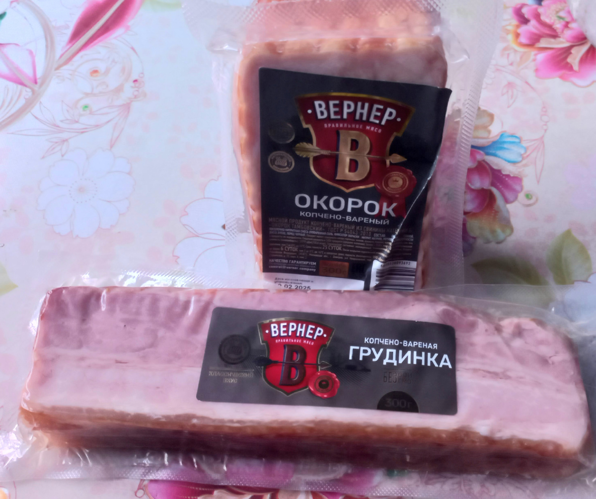 "Продавец колбасного отдела, на который напали грабители, не смог уберечь салями. Зато защитил докторскую!"😁 Здравствуйте, мои дорогие ❤️ У нас целую неделю гостила весна, с утра до вечера были заняты работами на участке, даже чуть не посадили картошку. А теперь опять всё в снегу. А как у вас дела? В прошлую поездку в "Чижик" решила попробовать мясные деликатесы, рассказываю свои впечатления. Отзыв основан на моём личном мнении, это не является рекламой, так как ни с кем не сотрудничаю, и всё купила в магазине за свои деньги. И то, и другое - "Вернер" - собственная торговая марка "Чижика". То есть, это означает, что производители выпускают специально для "Чижика" свою продукцию, с этикеткой "Вернер". Давайте, изучим, кто производит эти мясные вкусности. Грудинка Вернер классическая, копчёно-варёная, категория Б, 300 грамм, цена - 199 рублей. Ищем на этикетке изготовителя: ООО "Дмитровские колбасы", Московская область, город Дмитров. Это очень известная организация, которая работает с