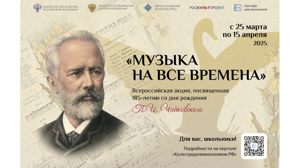 25 марта в рамках межведомственного культурно-образовательного проекта «Культура для школьников» пройдет Всероссийская акция «Музыка на все времена», посвященная 185-летию со дня рождения величайшего русского композитора П.И. Чайковского. Творчество Петра Ильича Чайковского – это вершина мировой музыкальной культуры. Его произведения, такие как балеты «Щелкунчик», «Лебединое озеро» и «Спящая красавица», стали символами классического искусства, а симфонии и оперы завоевали сердца миллионов слушателей по всему миру. Знакомство детей с произведениями великого композитора расширяет кругозор, обогащает их духовный мир и формирует уважение к культурному наследию России. Школьники со всей России могут принять участие в творческом соревновании и проявить свои таланты в музыкальном, хореографическом и художественном направлениях. Для этого необходимо подготовить работу в одной или нескольких из предложенных номинаций: «Инструментальное творчество», «Вокал», «Хореография», «Изобразительное творч