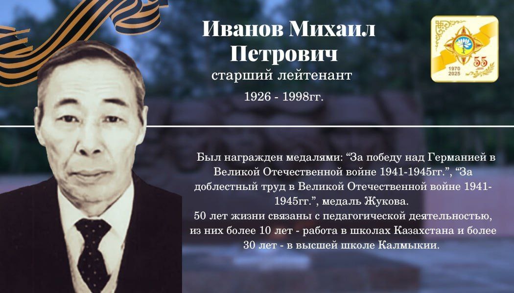 #КалмГУ_к_80_летию_Победы #Год_защитника_Отечества Известный в Калмыкии ученый, один из организаторов становления и развития исторической науки, высшей школы республики, заслуженный деятель науки РФ и РК, почетный работник высшего образования РФ, почетный гражданин города Элисты, доктор исторических наук, Ветеран Великой Отечественной войны. Зимой 1943 года Михаила Петровича отправляют на Южный участок фронта в составе стрелковой роты. В марте 1944 года по национальному признаку отправлен на Урал - на строительство Широковской ГЭС. Осенью 1945 года поступает на историко-филологический факультет Абаканского учительского института. За 11 лет трудовой деятельности М.П.Иванов вырос от учителя семилетней школы до заведующего районным отделом народного образования. Здесь в 1950 году ему удалось успешно окончить заочное отделение Казахского педагогического института имени Абая. Осенью 1958 года вернулся в родную Калмыкию. Более 30 лет Михаил Петрович посвятил преподаванию и научной деятельно
