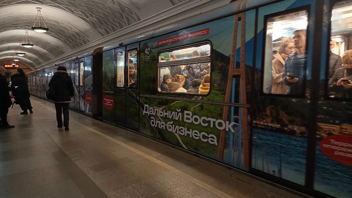 На самом деле, у меня вся неделя прошла под этим девизом "Чуть-чуть не успел". Не скажу, чтобы критично опаздывал, но вот н хватало порой минуты-другой. Даже в "Записки" писать времени не хватало. Лишь какие-то короткие зарисовки выходят. Вот и сегодня пишу буквально на бегу. Дословно. 1-2. Наверное, и сегодня не было бы ничего, ибо рысил я по метро в то время, когда все люди уже вовсю пятничную силу мчатся домой. Час пик, народ, и тут на станции Площадь революции в арках увидел нечто необычное. Нечто необычное оказалось ещё одним брендированным составом метро. Совершив рывок через людской поток, я почти успел... Но внутрь уже не попал, так как двери состава закрылись. В итоге получилось успеть снять лишь пару вагонов поезда "Дальний восток". И не самые нарядные, как мне показалось. Но как уж есть. Вот так как-то. ПС Почему-то большинство брендированных составов ходит по синей линии, Арбатско-Покровской. То ли там руководство депо более сговорчивее на дополнительные работы по оклейке