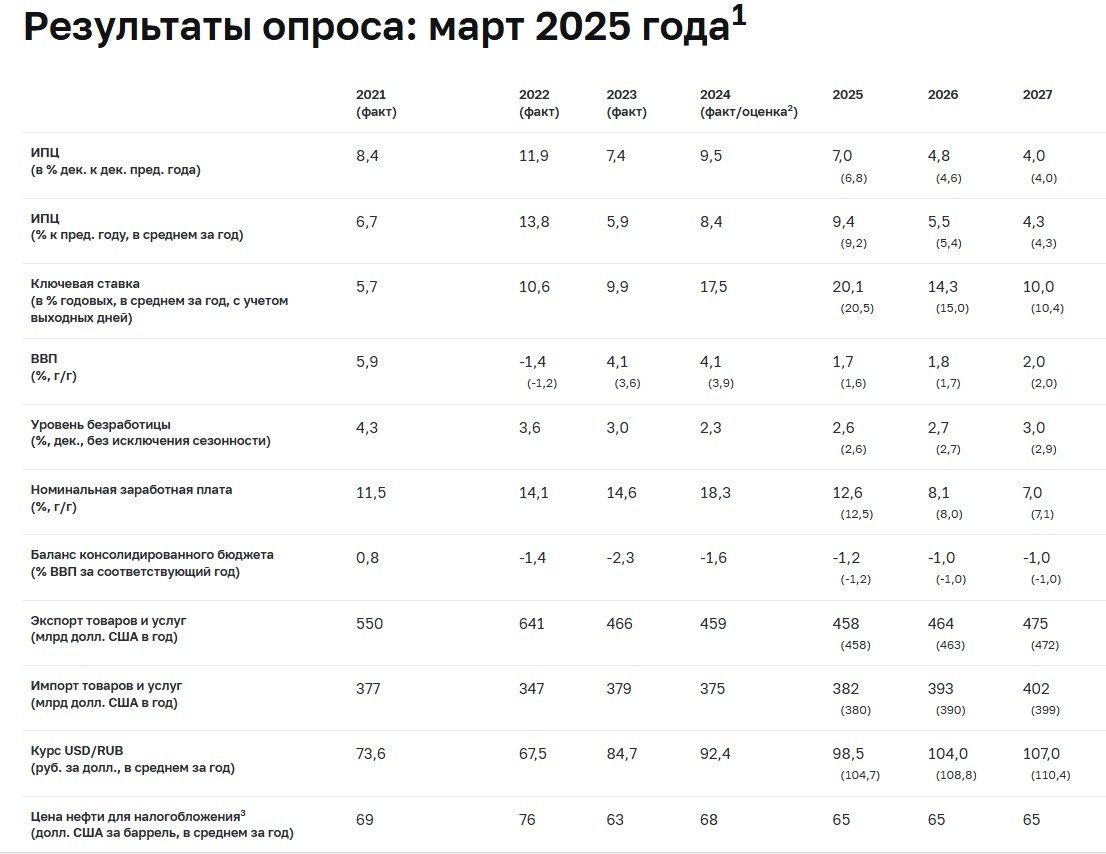 Традиционно в преддверии заседания по ключевой ставке ЦБ провел опрос аналитиков, которые представили свои прогнозы по ключевым макроэкономическим показателям, и опубликовал консенсус-прогноз. Вот он (в скобках показаны предыдущие данные). Пройдемся по основным изменениям. Прежде всего, бросается в глаза резкое снижение прогнозов по курсу доллара, которое, вероятно, следует из текущей ситуации с укреплением рубля. Если еще месяцем ранее аналитики ожидали средний курс доллара в 2024 году 104,7 рублей, то теперь снизили прогноз до 98,5 рублей. В 2026 году - до 104 рублей, в 2027 - до 107 рублей за доллар. При этом, что интересно, прогнозная цена нефти вообще не изменилась, составляет все так же 65 долларов за баррель Urals в среднем за год - напомню, сейчас она стоит около 60 долларов. И также, что еще более интересно, вообще не изменились прогнозы по экспорту, а по импорту даже чуть выросли: с 380 до 382 долларов в текущем году. Почему это интересно? Потому что, судя по всему, основной