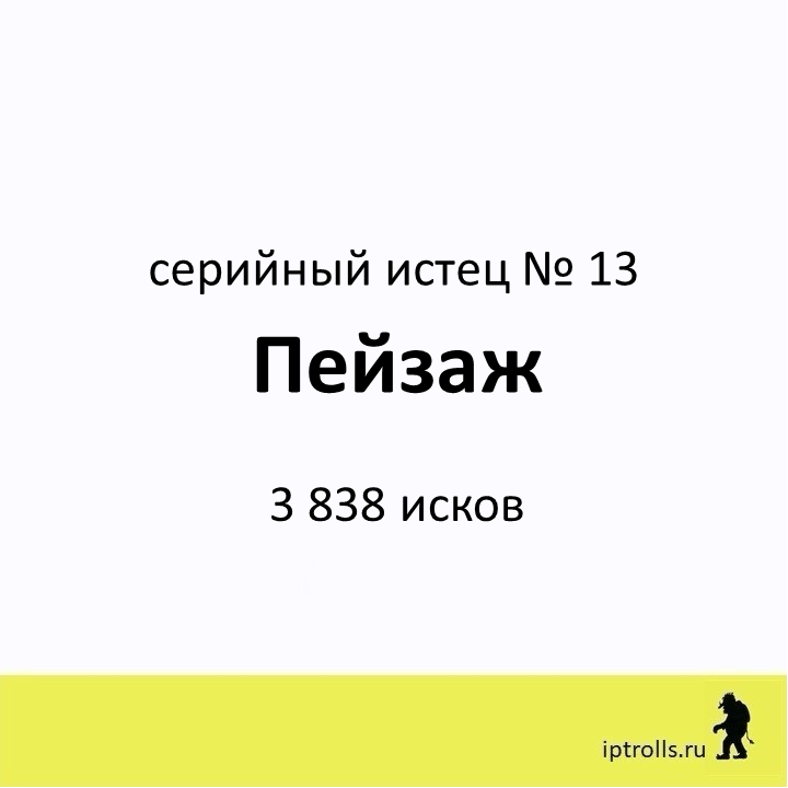 Мы собрали информацию о правообладателях, массово подающих претензии и иски в защиту авторских прав и прав на товарные знаки, а также полезные материалы и рекомендации, чтобы вы могли: Сейчас в базе более 60 серийных истцов. Вы можете проверить, не нарушаете ли вы чьи-то интеллектуальные права в рамках своего бизнеса или проекта, получить ответы на популярные вопросы и проконсультироваться. Правообладатель Пейзаж внесен в базу IPTrolls под № 13. Переходи в карточку правообладателя на сайте IPTrolls, чтобы узнать больше. Если вы не нашли ответ на свой вопрос, посмотрите другие материалы проекта или напишите нам через форму на сайте. _____________________ команда проекта IPTrolls 🕵🏻♂️Следите за обновлением базы