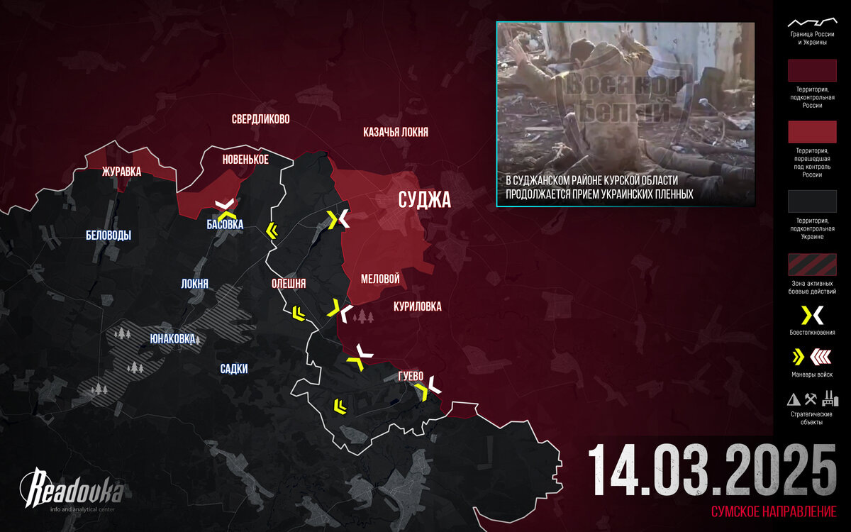 Редакция Readovka собрала самые важные события 14 марта в разрезе СВО. Русские войска готовятся к широкомасштабному наступлению на Сумскую область, малые группы ВС РФ проводят разведывательные проникновения вглубь территории противника практически на всем протяжении государственной границы России с Сумской областью. В Одессе ликвидирован один из убийц людей в Доме профсоюзов 2 мая 2014 года Ганул. Генсек НАТО Рютте заявил, что вопрос вступления Украины в НАТО более не обсуждается. Президент США Трамп сообщил, что в беседе с Путиным попросил пощадить окруженные в Курской области украинские подразделения..