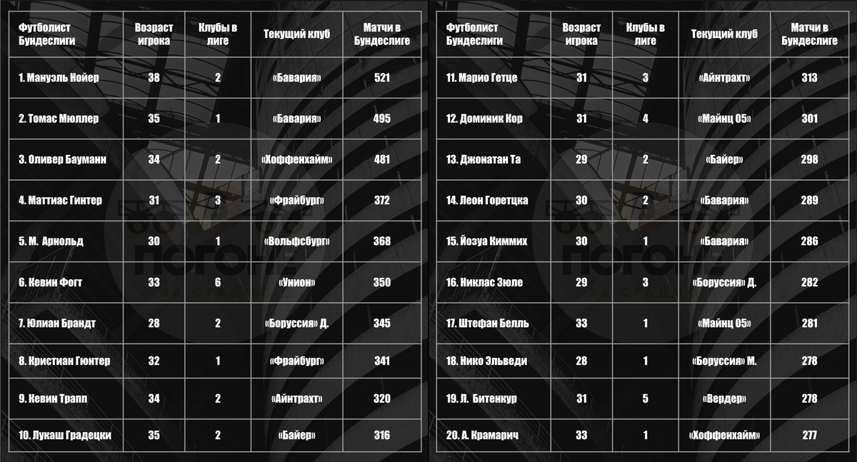 Действующие лидеры Бундеслиги по сыгранным матчам.