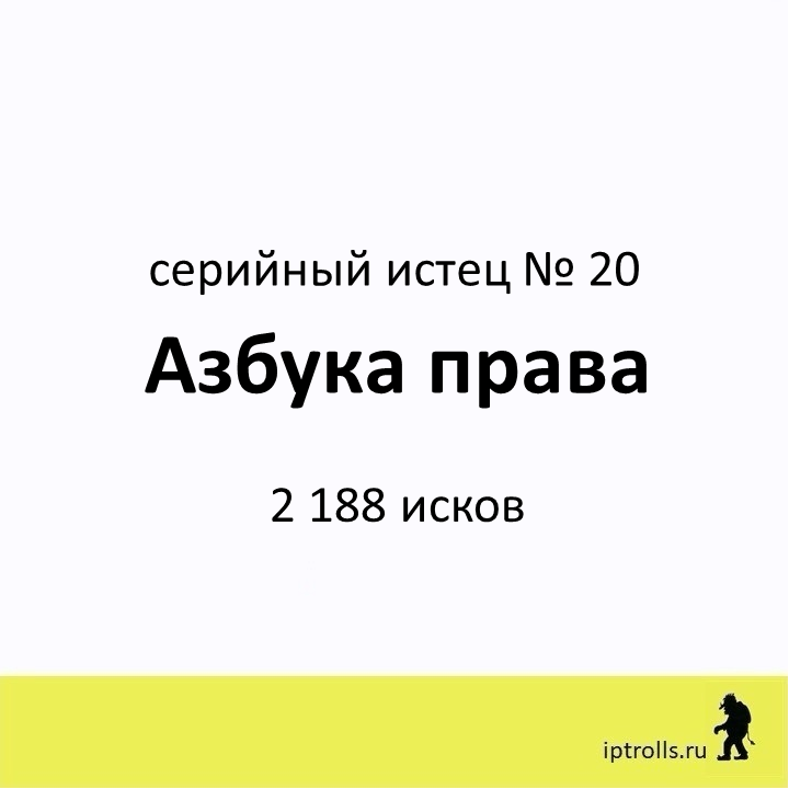 Мы собрали информацию о правообладателях, массово подающих претензии и иски в защиту авторских прав и прав на товарные знаки, а также полезные материалы и рекомендации, чтобы вы могли: Сейчас в базе более 60 серийных истцов. Вы можете проверить, не нарушаете ли вы чьи-то интеллектуальные права в рамках своего бизнеса или проекта, получить ответы на популярные вопросы и проконсультироваться. Правообладатель Азбука права внесен в базу IPTrolls под № 20. Переходи в карточку правообладателя на сайте IPTrolls, чтобы узнать больше. Если вы не нашли ответ на свой вопрос, посмотрите другие материалы проекта или напишите нам через форму на сайте. _____________________ команда проекта IPTrolls 🕵🏻♂️Следите за обновлением базы