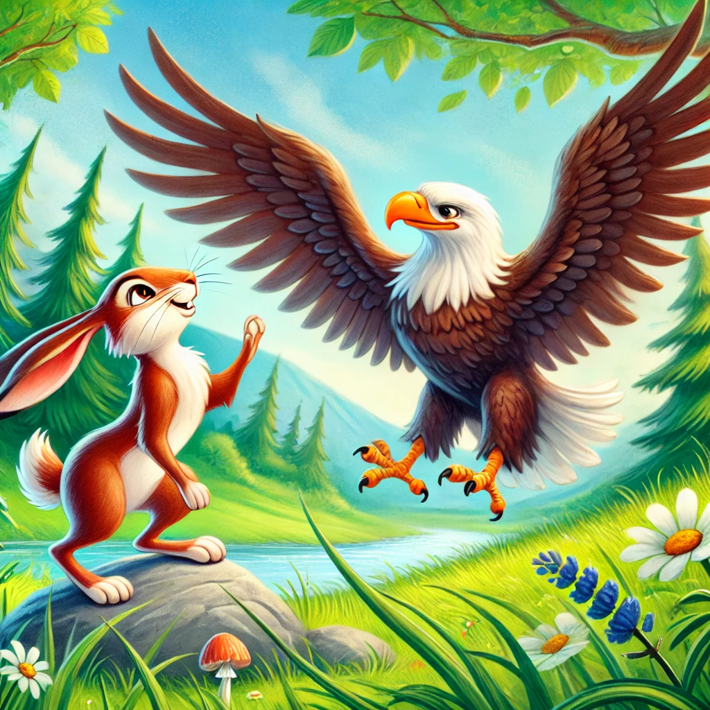 Жил-был заяц по имени Прыг-скок. Быстрый, ловкий, уши – во! – как антенны. А в тех же краях обитал орёл Громокрыл – гордый, сильный, а летал так, что аж ветер завидовал. Однажды встретились они на поляне. – Я самый крутой в лесу! – заявил заяц, выпендриваясь. – Бегаю, как молния, никто меня не догонит! – Ха! – усмехнулся орёл. – А я летаю выше всех! Кто летает, тот и главнее! – А вот и нет! Ты внизу меня не поймаешь, а я наверх не полезу – значит, мы равны! – Да ну? А давай проверим, кто круче! Согласились. Заяц вызвал орла на забег: – Кто первым добежит от дуба до реки – тот и победил! Громокрыл только крылья расправил – и уже у реки. – Ха, заяц! Ты только стартанул, а я уже чаек пью! Заяц надулся, но не сдался: – Теперь моя очередь! Давай наперегонки в нору! Орёл попробовал – не пролез. – Эй! Это нечестно! – Ага! – усмехнулся заяц. – Так же, как тебе со мной бегать! Посмотрели друг на друга, почесали головы – и поняли: никто не круче, просто каждый в своём деле мастер. С тех пор не