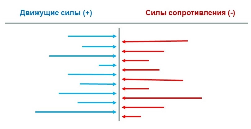 Левин утверждал, что для успешного внедрения изменений необходимо создать баланс между этими силами. Если сдерживающие силы превышают движущие, изменения не произойдут.