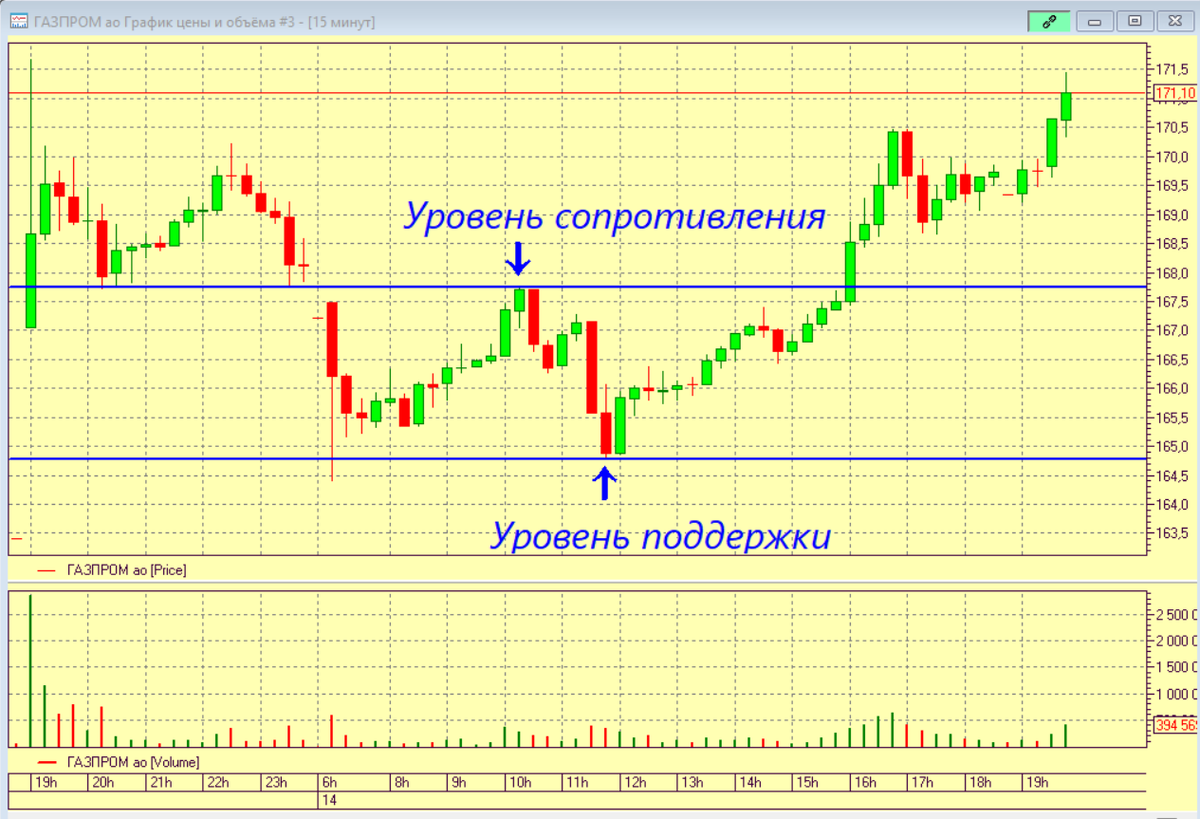 Если цена пробивает уровень сопротивления снизу вверх, то затем она очень часто возвращается к нему сверху и, отбившись от него, уже как от уровня поддержки уходит еще дальше вверх. На рисунке 14 представлен ценовой график акций «ГАЗПРОМ ао» с масштабом времени один час на котором уровень сопротивления после того как цена пробила его снизу вверх, становится уровнем поддержки.