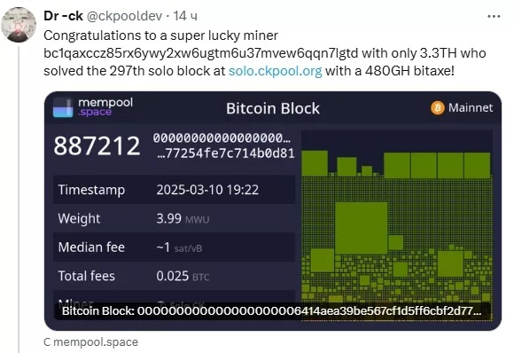 10 марта 2025 года майнер-одиночка смог добыть блок #887 212 в сети биткоина с использованием домашней установки Bitax, которая имеет хешрейт 480 GH/s. Вознаграждение за успешную добычу составило 3,15 BTC, что эквивалентно приблизительно $250 000 по текущему курсу. Как сообщил Кон Коливас, администратор майнинг-пула CKPool, вероятность добычи блока с такой мощностью хешрейта составляет один на миллион, что означает, что в среднем для достижения подобного успеха потребуется около 3500 лет работы одного устройства. В майнинге использовались шесть установок Bitax от компании D-Central Technologies с общим хешрейтом порядка 3,3 TH/s. Блок был найден на одной из моделей Ultra, оснащенной ASIC-чипом для Antminer S19XP от Bitmain. Стоимость оборудования Bitax в США варьируется от $169 до $299, в зависимости от модели. Более мощные версии, такие как Bitax Gamma и Supra, оснащены микросхемой для Antminer S21, которая принадлежит последнему поколению ASIC-майнеров. Коливас отметил, что использов
