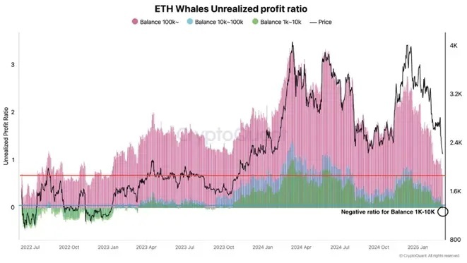 Эксперты CryptoQuant сообщили, что эфириум переживает непростой период, поскольку соотношение нереализованной прибыли среди крупных держателей эфира значительно упало. Это снижение не наблюдалось с прошлого "медвежьего" цикла, и теперь нереализованная прибыль крупных держателей эфира (от 1 000 ETH до 10 000 ETH) стала отрицательной. По словам аналитиков, эфириум сейчас сталкивается с рядом проблем. В частности, соотношение ETH/BTC продолжает снижаться, а рынок подвергается интенсивному FUD (страху, неуверенности и сомнениям), что делает ситуацию еще более напряженной. Также стоит отметить, что снижается число поисковых запросов по эфиру в Google, что указывает на снижение интереса к криптовалюте. Несмотря на то что эфириум в последние месяцы демонстрировал рост стоимости, аналитики не прогнозируют быстрого восстановления бычьего тренда для эфира в ближайшем будущем. Ожидается, что рынок продолжит испытывать сложную динамику цен. Кроме того, эксперты компании Matrixport сообщили о сниже