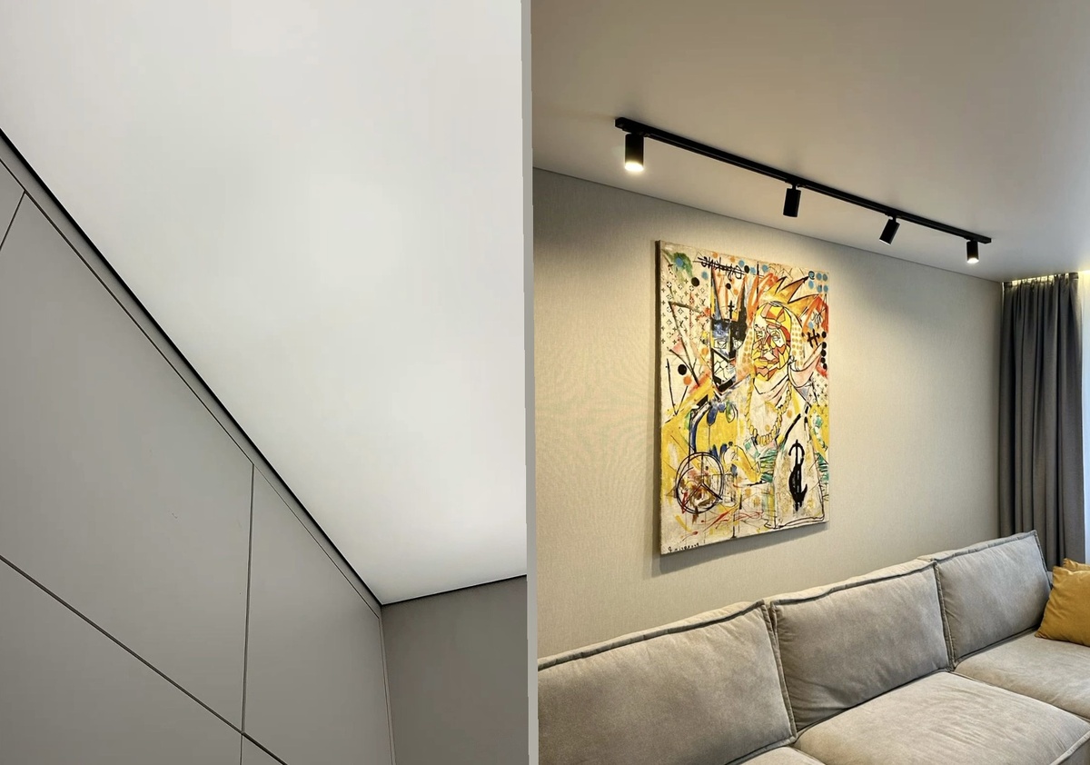 В настоящий момент самым доступным, быстровозводимым и практичным остается натяжной потолок. Устанавливается за 1 день, не боится протечек, ремонтопригодный, не желтеет со временем, подходит под любой интерьер, гипоаллергенен и удобен для монтажа всех типов светильников: подвесных, накладных, встроенных или запотолочных.