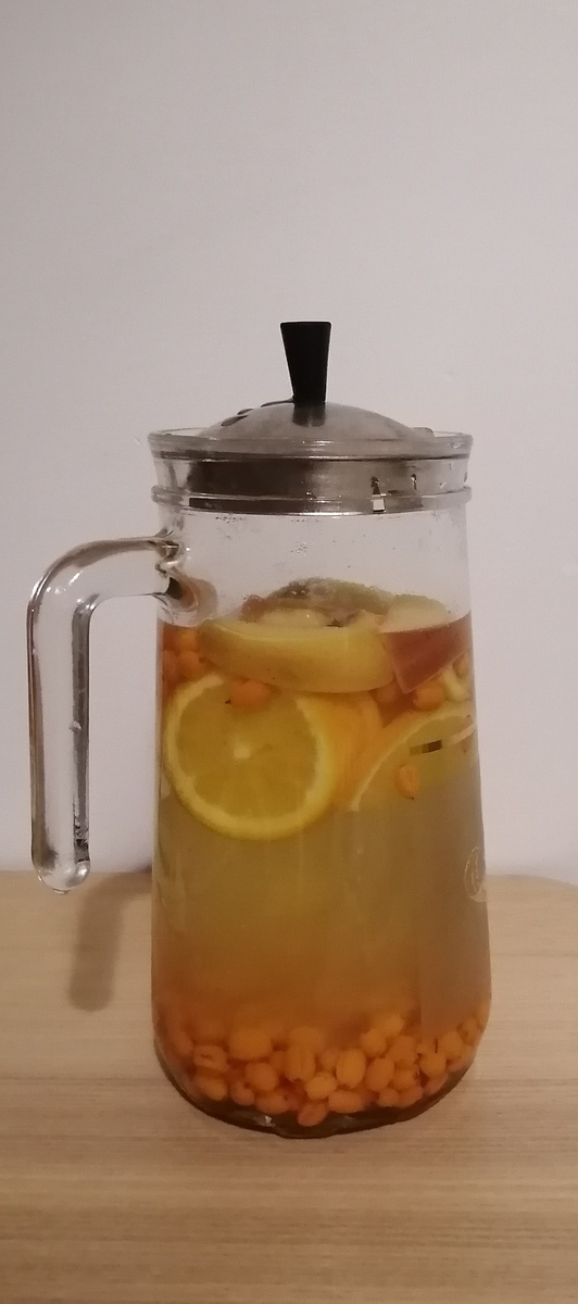 14 марта /уже 15 марта 2025 г. Кухонные радости). Всем привет! Сегодня, то есть, уже вчера был день сна, оказывается. Надо было хотя бы в честь этого спать лечь пораньше, но увы и ах). Всё какие то дела, тайм менеджмент совершенно не соблюдается, режим тоже не подвластен. У нас снегопад, зима вернулась, не холодно, но влажная зябкость. Что то сегодня я начала шмыгать чуток. Решила поэтому сделать витаминный напиток, он вкусный и полезный, а ещё яркий, красивый, солнечный. Солнечный витаминный напиток. Здесь облепиха, апельсин и яблоко, залит кипятком. Потом ещё мед можно добавить по желанию. Или имбирь можно. Облепиху купила в Ленте, 329 р за кг. Апельсины из Перекрёстка, 150 р вроде кг, кисловатые, это даже хорошо, вит С, значит, больше. В закромах холодильника лежала редька Дайнон. Редьку, репу я люблю. Но эта островатая. Не долго думая, решила салат сделать. Как всегда, из того, что под рукой. Не зря говорят, что женщины из всего сделают шляпу, скандал и салат!). Под рукой ока