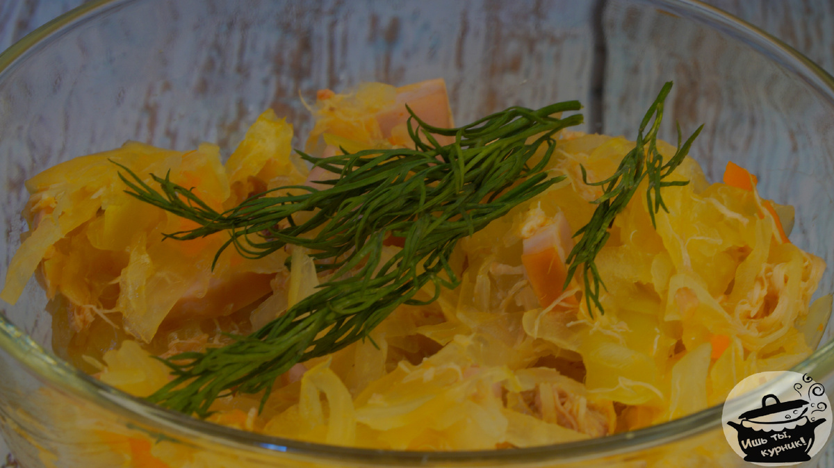 Репчатый лук мелко нарезать и слегка поджарить с топленым маслом или свиным салом, прибавить пшеничную муку и жарить вместе с луком еще некоторое время, наблюдая при этом, чтобы лук не так сильно поджарился. Затем влить немного мясного бульона, добавить томат-пюре и, помешивая, прокипятить. Кислую шинкованную капусту отжать от излишков сока, а если она очень кислая, то погрузить на 5-10 минут в кипящую воду и откинуть на дуршлаг. В сотейнике или другой посуде распустить топленое свиное сало, положить подготовленные капусту и лук с томатом, добавить лавровый лист, тмин, посолить и тушить на слабом огне, покрыв посуду крышкой. При тушении капусту время от времени перемешивать. Когда капуста станет мягкой, добавить очищенные от кожицы и семян мелко нарезанные соленые огурцы, нарезанную мелкими кубиками (8-10 мм) вареную копченую грудинку или ветчину, немного мясного бульона и снова тушить 15-20 минут. Перед подачей заправить молотым красным или черным перцем. Подать в горячем виде, посыпа