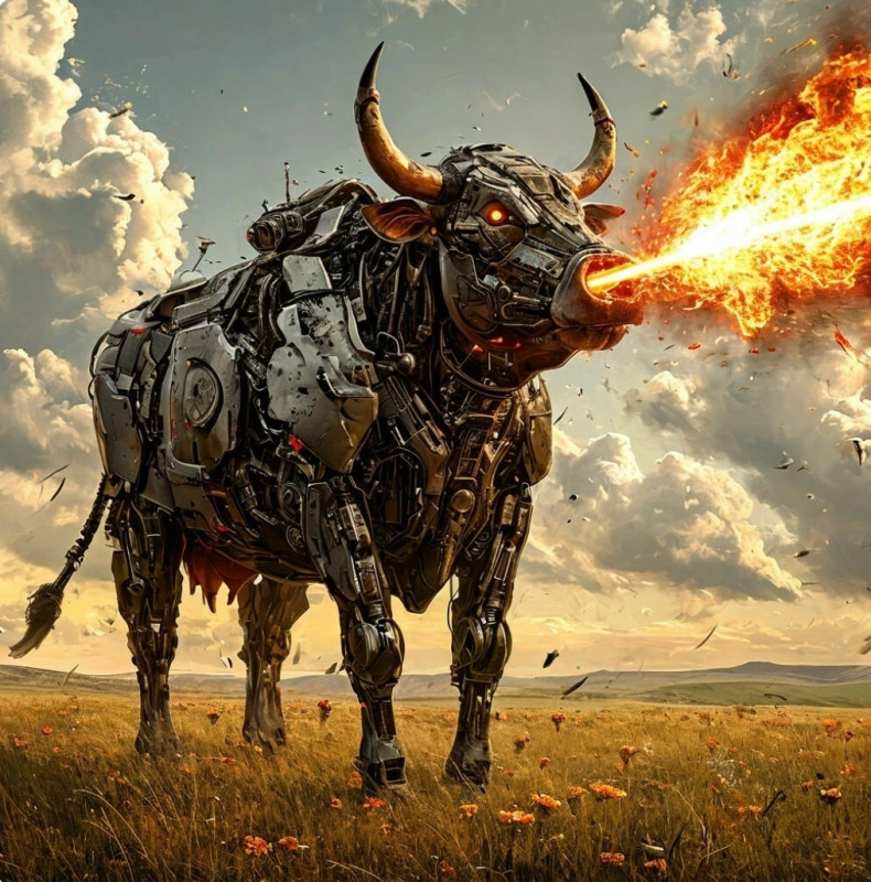 Прокофий ускорил шаг, стараясь не выпускать корову из поля зрения. Именно благодаря этому он заметил, как та широко раскрыла вонявшую метаном пасть, покрытую изнутри скользким закопчённым металлом. где-то в глубине глотки затрещали искры и вырвалась огненная струя. Только натренированная на парах физкультуры реакция позволила Прокофию увернуться.