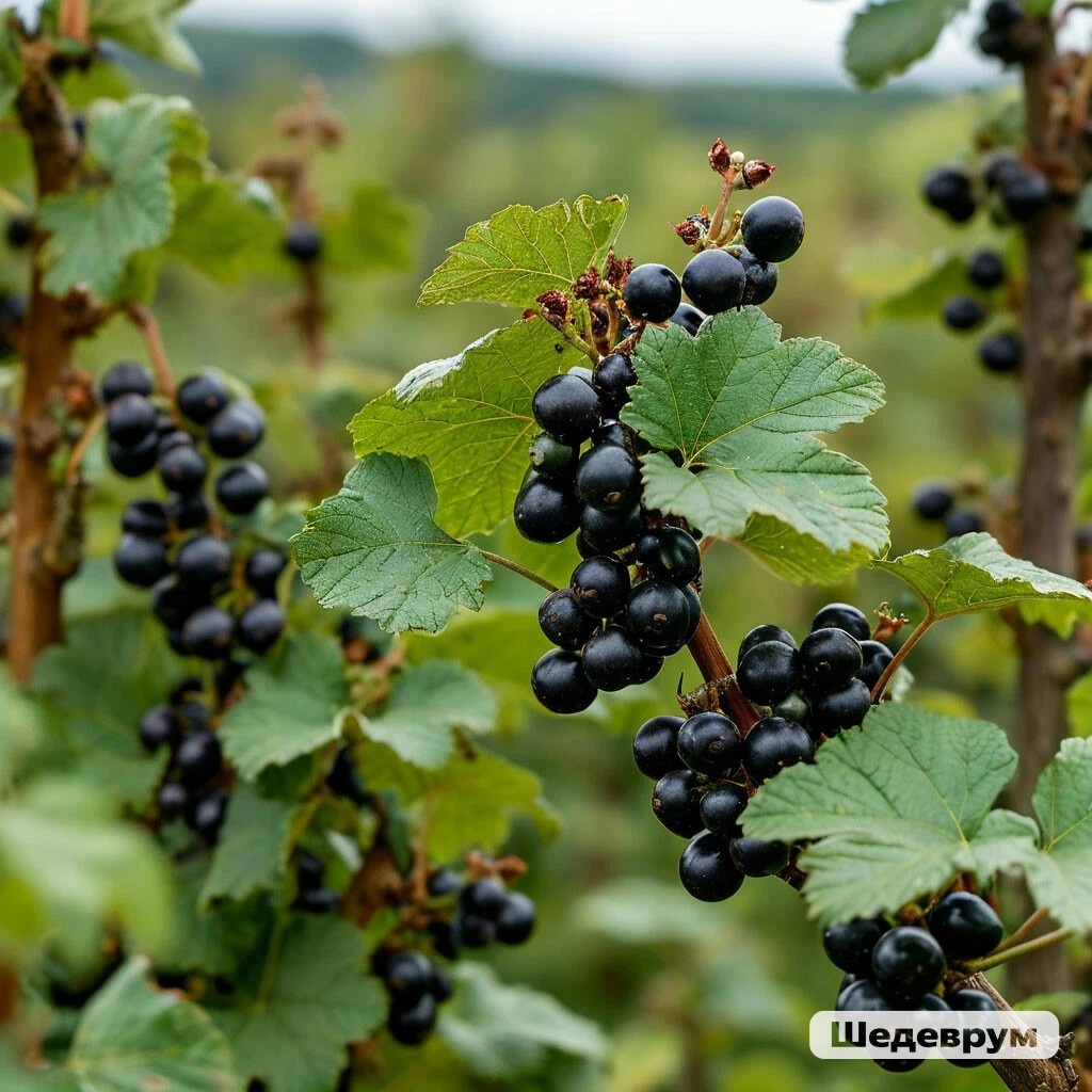 - Черная смородина — самая популярная благодаря своему насыщенному вкусу и высокому содержанию витамина C. Сорта, такие как «Ядреная», «Добрыня», «Селеченская-2», отличаются крупными ягодами и устойчивостью к мучнистой росе.