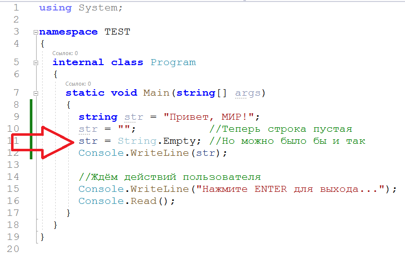 Однако в C# есть один способ получить пустую строку. И хотя он более длинный, некоторые считают, что при инициализации (а в C# инициализация обязательна) лучше использовать именно его, поскольку это вроде как более понятно. Хотя, конечно, это вопрос спорный. Потому что даже начинающему программисту совершенно понятно, что “ничего”, заключённое в кавычки, и есть пустая строка.