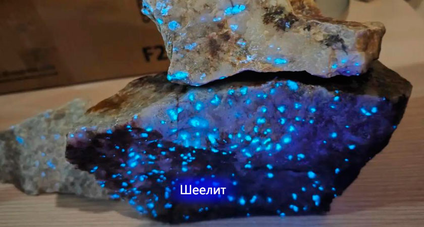 Под воздействием ультрафиолетового света шеелит излучает синюю флуоресценцию, что является одной из самых характерных характеристик шеелита, делающей его уникальным в минералогии и ювелирной промышленности.