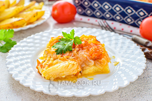 При приготовлении рыбы многие привыкли использовать сметану, но есть способ ещё проще и надёжнее, который делает рыбку особенно нежной. Пока рыба будет мариноваться, мы быстро подготовим лук и помидоры, слегка их потушим и уложим сверху – они придадут мягкую кислинку и дополнят вкус. Потом останется только отправить всё в духовку и немного подождать. Но есть один важный момент: какую рыбу выбрать? Конечно, можно взять стейки – они выглядят красиво, но кости могут испортить всё удовольствие от еды. Никому не хочется сидеть за столом и осторожно выбирать косточки, особенно если блюдо подаётся детям или готовится для быстрого ужина. Поэтому лучше всего использовать филе – оно впитает маринад, останется нежным и позволит сосредоточиться на вкусе, а не на поиске костей. Мы будем готовить именно так – просто, удобно и без лишних хлопот. Для этого понадобится 800 г рыбного филе или стейков, например, палтуса. Нарезаем его на порционные куски, сбрызгиваем 1 столовой ложкой лимонного сока. Смеш
